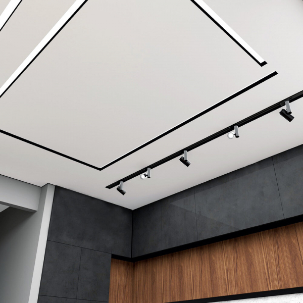 - встроенное освещение позволяет создать высокотехнологичный и функциональный интерьер. Существует множество вариантов монтажа света в натяжные потолки: это трековые светильники, световые линии, ниши SLOTT, витражные поверхности, полупрозрачные, Double Vision;